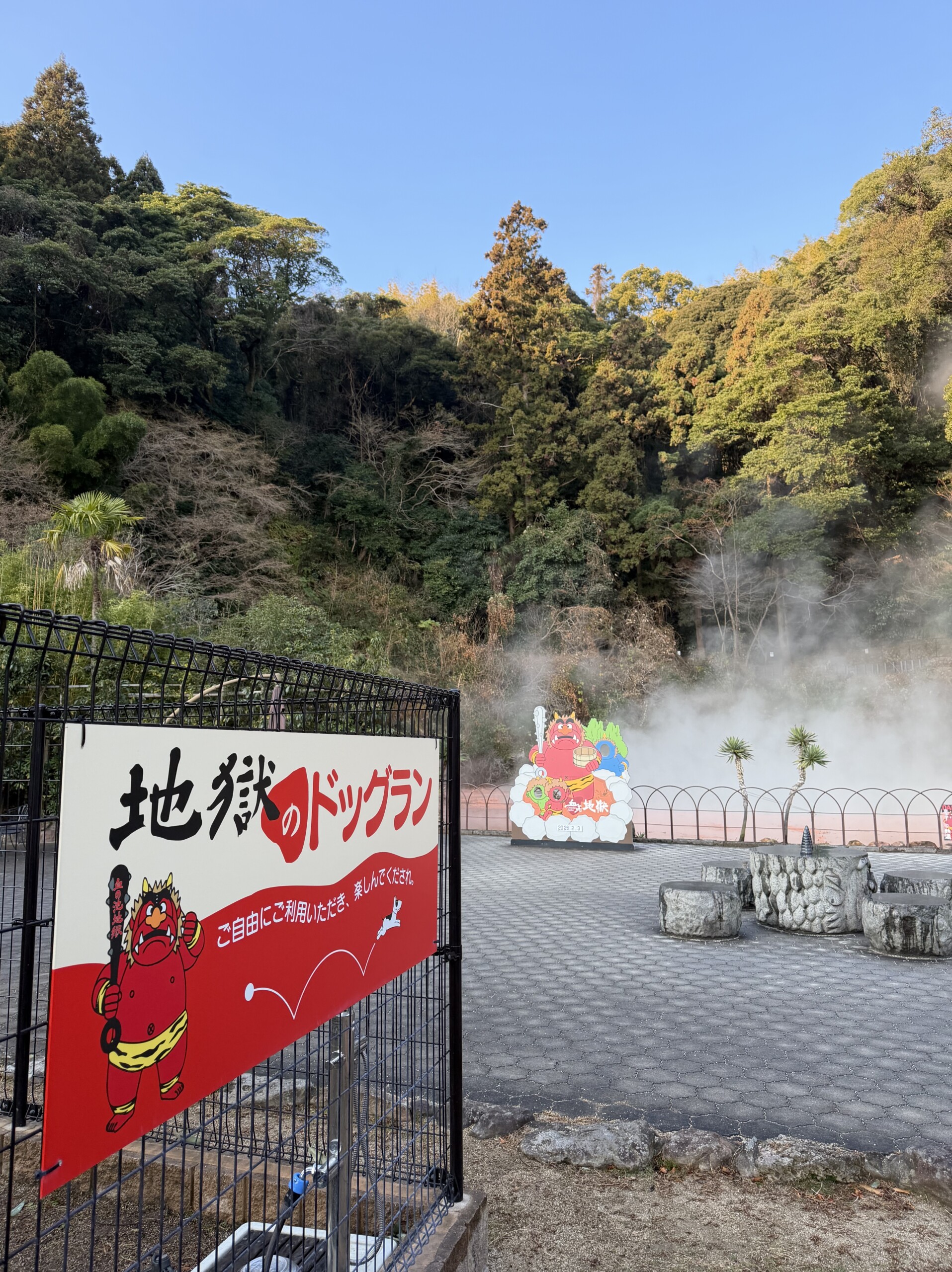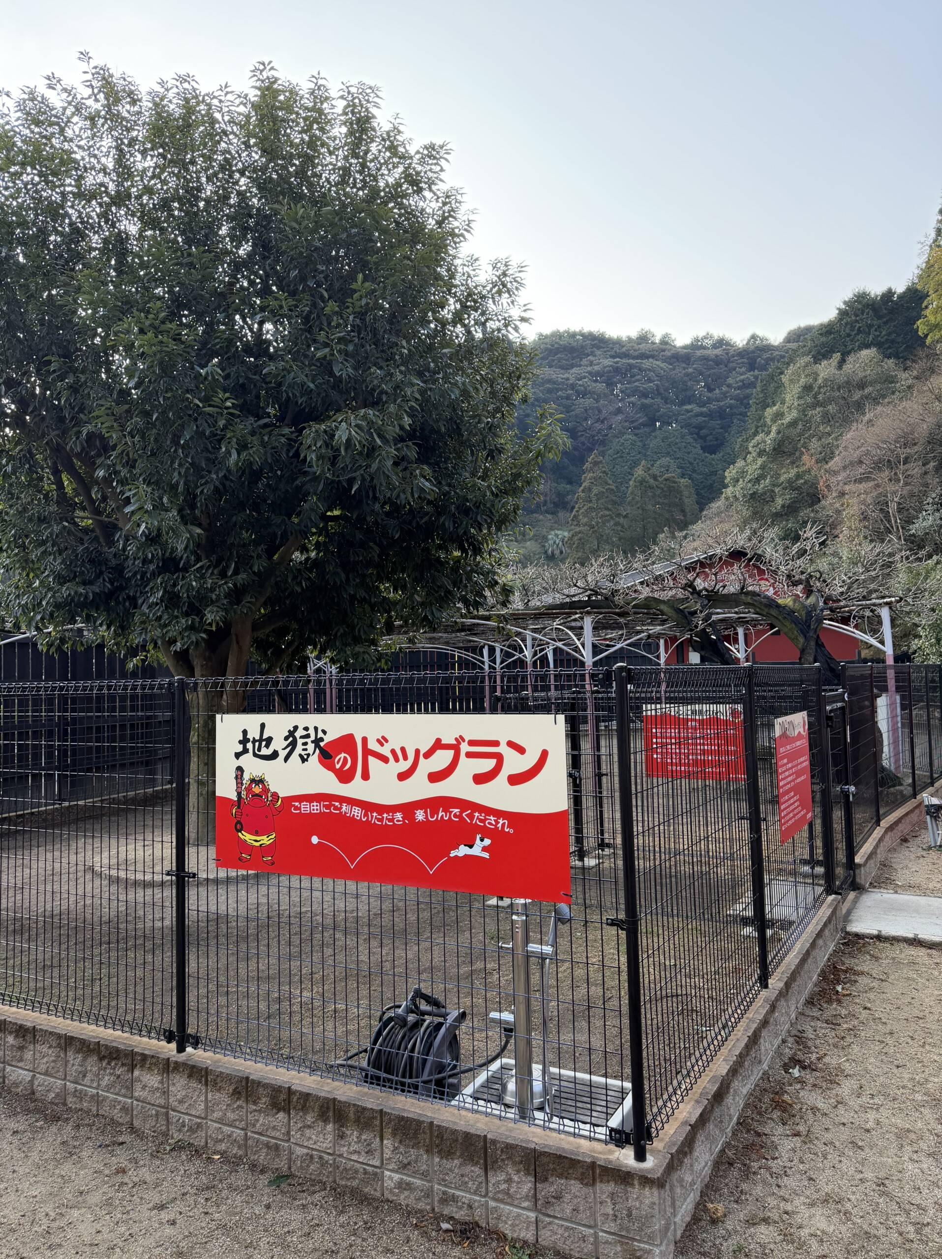 地獄めぐりはペットフレンドリーでして、ここの血の池地獄にはドッグラン完備です🐕