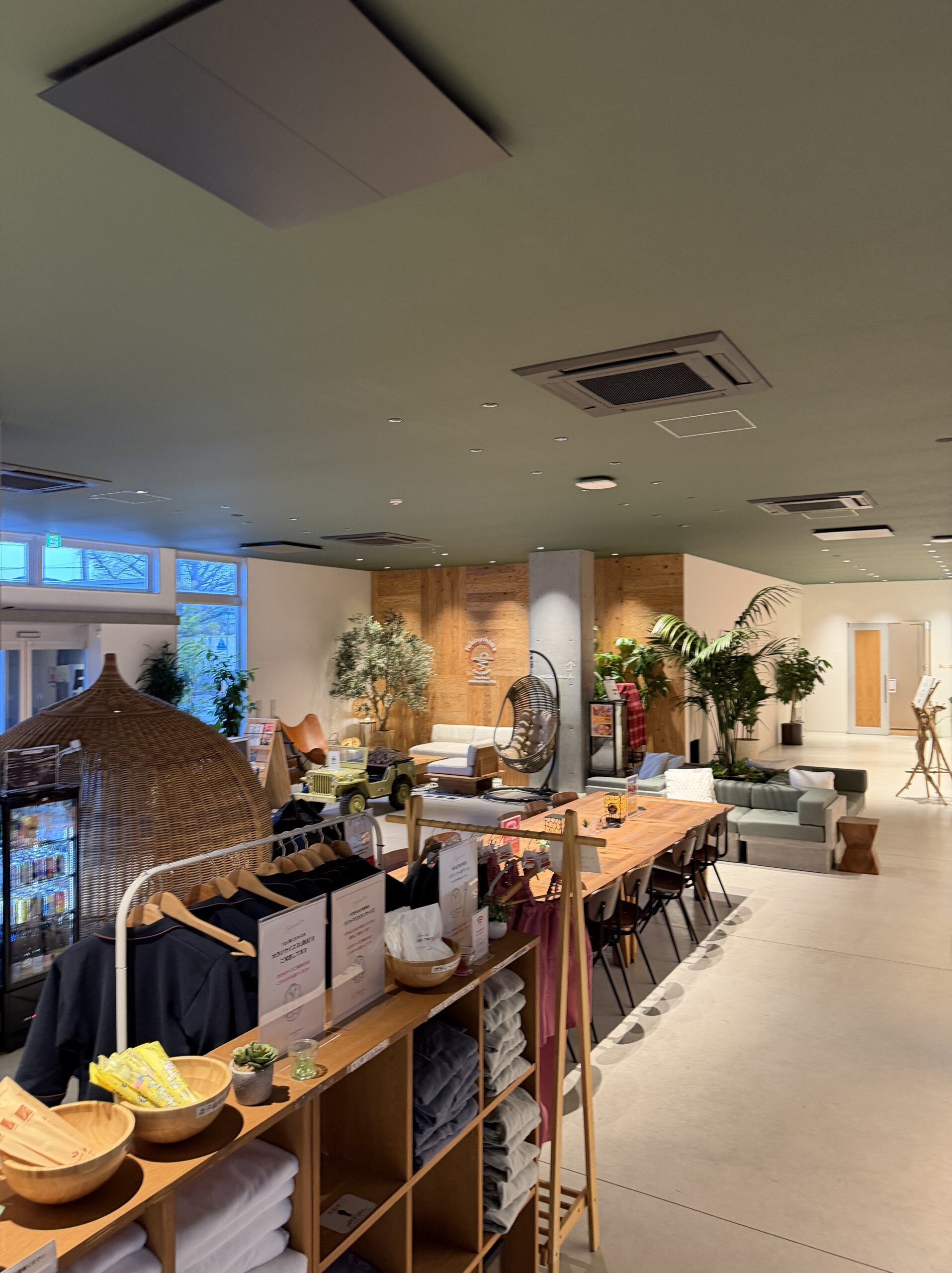 隣に温泉施設が直結をし、ホテル棟とグランピング、トレーラーハウスがある